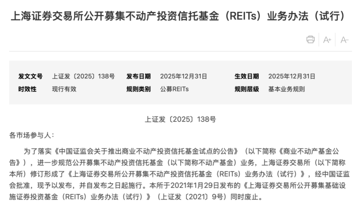 根据证监会关于推动商业不动产REITs试点的统一部署,12月31日,沪深交易所修订发布了《公开募集不动产投资信托基金(REITs)业务办法(试行)》(以下简称《不动产基金业务办法》),并完善了相关配套业务指引及指南。本次修订旨在进一步完善不动产投资信托基金(REITs)业务规则体系,健全市场功能,保障商业不动产REITs试点平稳起步,推动REITs市场高质量发展,增强多层次资本市场服务实体经济质效。
